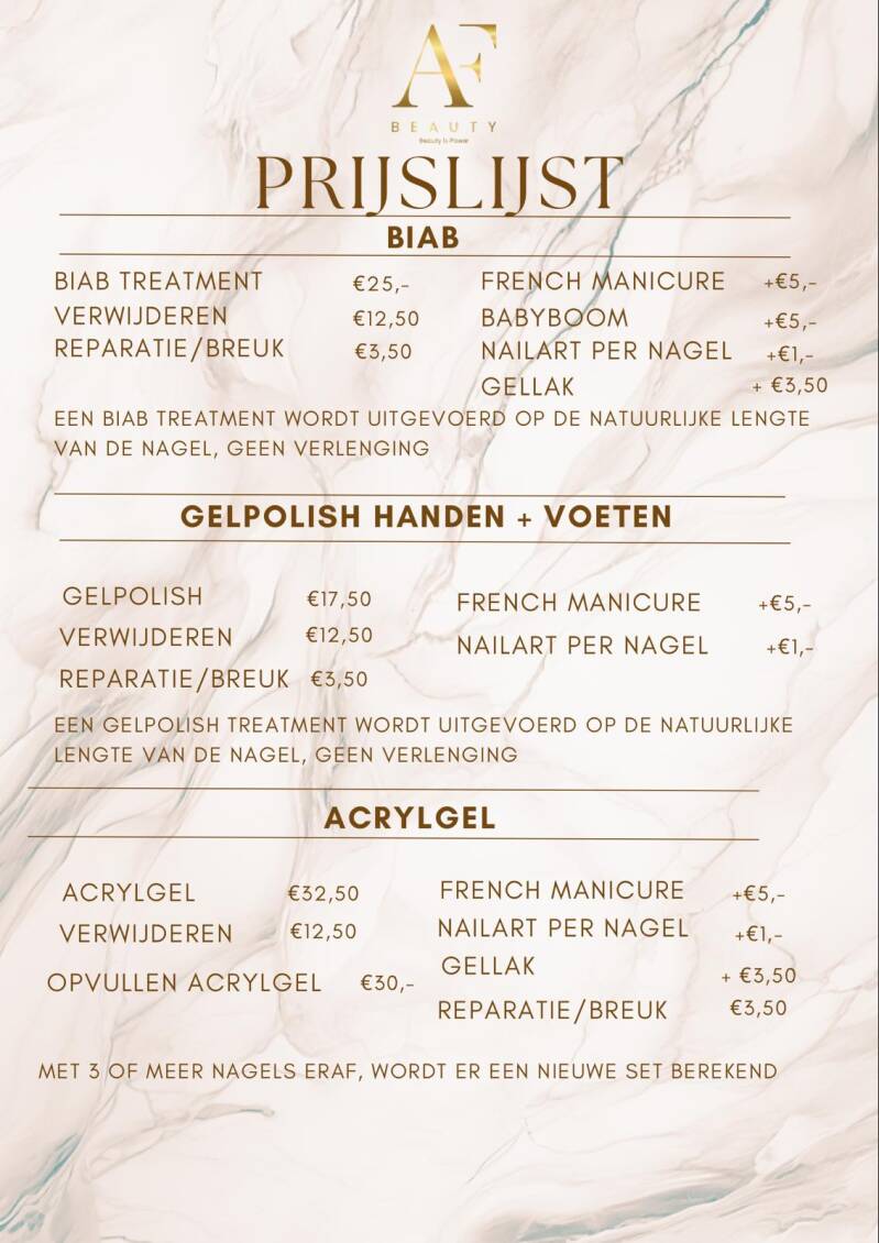 Om de topkwaliteit van jullie nagels te kunnen blijven garanderen, werk ik uitsluitend met hoogwaardige producten. Door de stijgende kosten ben ik daarom genoodzaakt om per 1 januari 2026 de prijzen met €3,50 te verhogen.